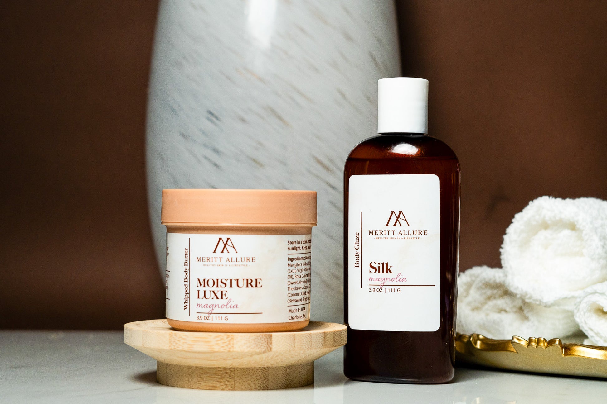 It’s best to apply the Moisture Luxe Whipped Body Butter first to damp skin, then apply a thin layer of the Silk Body Glaze body oil to seal in moisture that lasts longer throughout the day. Use daily for best results.
