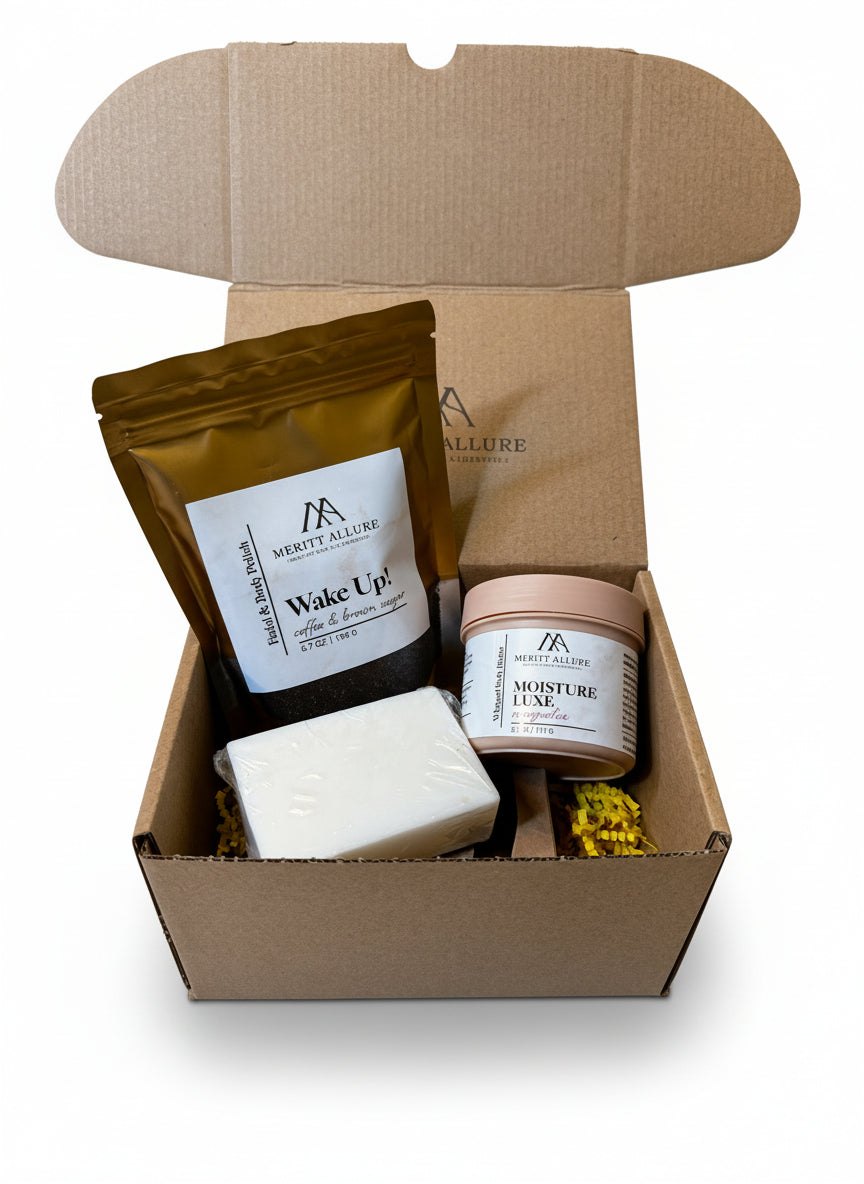 Start with our Golden Oats Bar Soap, a creamy blend of goat milk, honey, and oats designed to soothe and hydrate while gently cleansing even the most sensitive skin. Follow up with the Wake Up! Facial & Body Polish to slough away dull, dead skin and reveal brighter, smoother texture using the power of coffee, shea butter, and brown sugar. Lock in long-lasting moisture with our signature Moisture Luxe Whipped Body Butter, formulated with shea, aloe vera oil, and rosehip oil to soften skin, fade dark spots, and provide relief for dryness and eczema-prone areas.